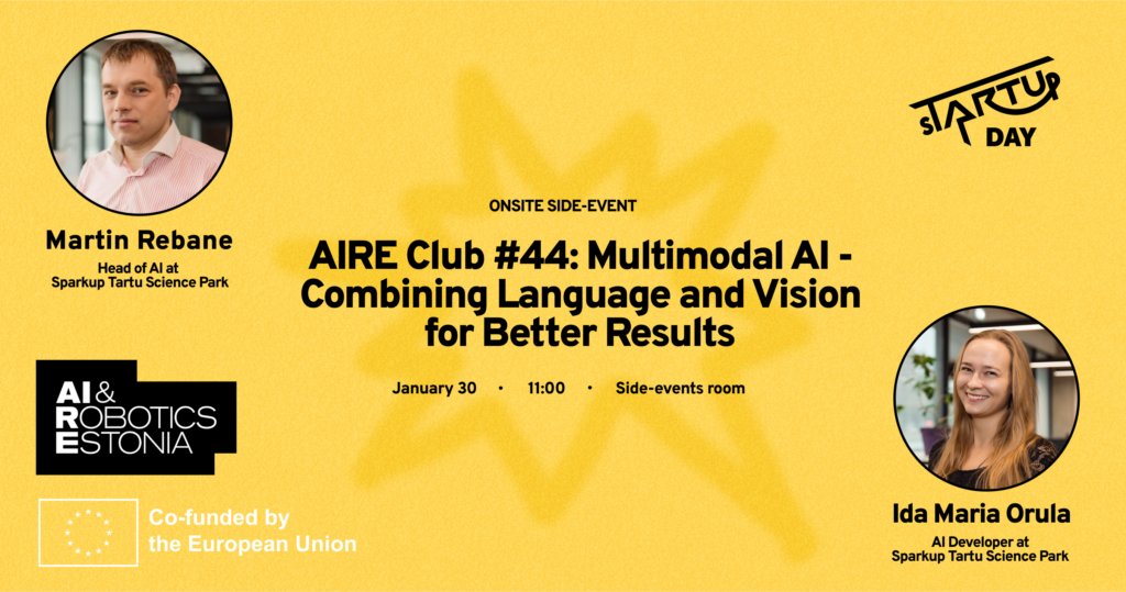 sTARTUp Day, reedel, 30.01 kell 11 kõrvalürituste ruumis AIRE Club #44: Multimodal AI – Combining Language and Vision for Better Results Multimodaalsetel tehisintellekti mudelitel on suur potentsiaal, kuid täna jääb neil sageli puudu reaalajas vajalikust täpsusest keerukate ülesannete puhul, nagu objektide loendamine või kriitiliste defektide tuvastamine. Ettekanne käsitleb, miks ühest mudelist enamasti ei piisa, kuidas […]