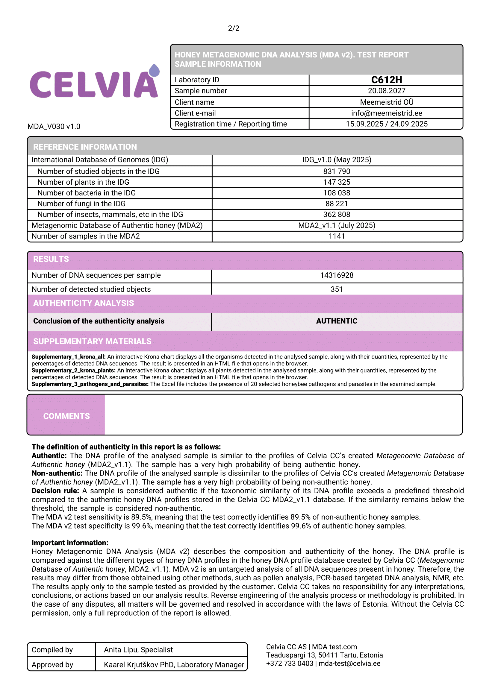 Sel aastal lisasime meele veel ühe teadusliku kihi – lasime teha mee DNA-d analüüsida Celvia laboris, mis asub samuti Tartu Teaduspargi ärilinnakus. Celvia pakub Honey Metagenomic DNA Analysis (MDA) teenust, mis tuvastab kõik liigid, kellega mesilased on kokku puutunud – alates taimedest ja seentest kuni mikroorganismideni. Tulemuseks on iga mee unikaalne geneetiline profiil, mis näitab selle päritolu ja autentsust.